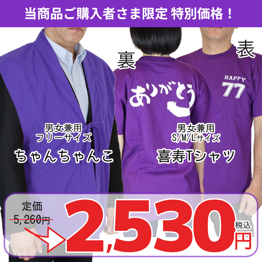 喜寿に紫のちゃんちゃんを着るのは、古くは貴族の冠位において、紫色が最上位を表す色であったりと、気品や風格を備えた色として尊ばれてきたことから、やがて、長寿への敬意といたわりの心が込めて、庶民でも紫色のちゃんちゃんこが贈られるようになりました。